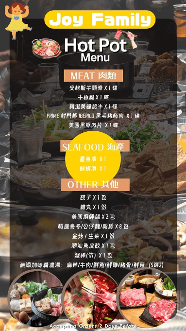 Joy Instant提供了豐富多樣的素食配菜選擇。此外,菜單還提到可供25人預訂,適合各類型的聚會活動使用。